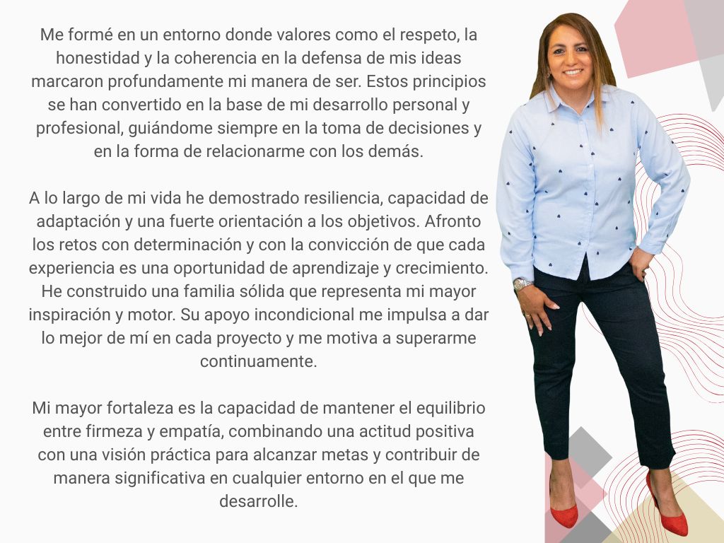 Soy una profesional valiente, perseverante y apasionada. Mi liderazgo cercano se basa en la confianza, la comunicación efectiva y la construcción de equipos sólidos, siempre guiada por la coherencia con mis ideales y el compromiso con cada proyecto que emprendo.
